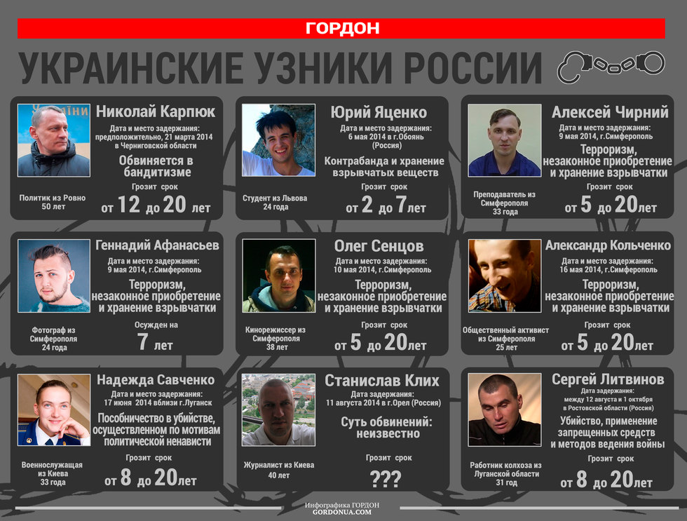Поименный список украинцев, которых в качестве заложников удерживает Россия, угрожая им внушительными тюремными сроками. "ГОРДОН" собрал девять историй украинских пленников Москвы, среди которых и активисты "Правого сектора", и работники колхоза – читайте подробнее в спецпроекте "ГОРДОН".