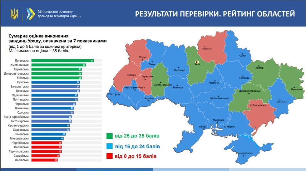 В Министерстве развития общин и территорий Украины составили рейтинг выполнения облгосадминистрациями решений Кабинета Министров в сфере борьбы с эпидемией COVID-19. Об этом проинформировал 17 июня сайт Кабмина. Рейтинг составляли по семи показателям, разделенным по двум направлениям: выполнение поручений правительства (соблюдение режима въезда-выезда из областей, ситуация с обеспечением обсервации, ситуация с выплатами зарплат медикам, соцзащита во время карантина) и выполнение поручений премьер-министра, в частности дезинфекция и обеспечение населения ПЦР-тестированием. Больше всех баллов получили Луганская и Хмельницкая области, меньше всех – Львовская. 17 июня стало известно об антирекорде в Украине: за сутки COVID-19 подтвердили у 758 человек, 31 больной умер. Общее число случаев коронавируса в стране превысило 33 тыс.