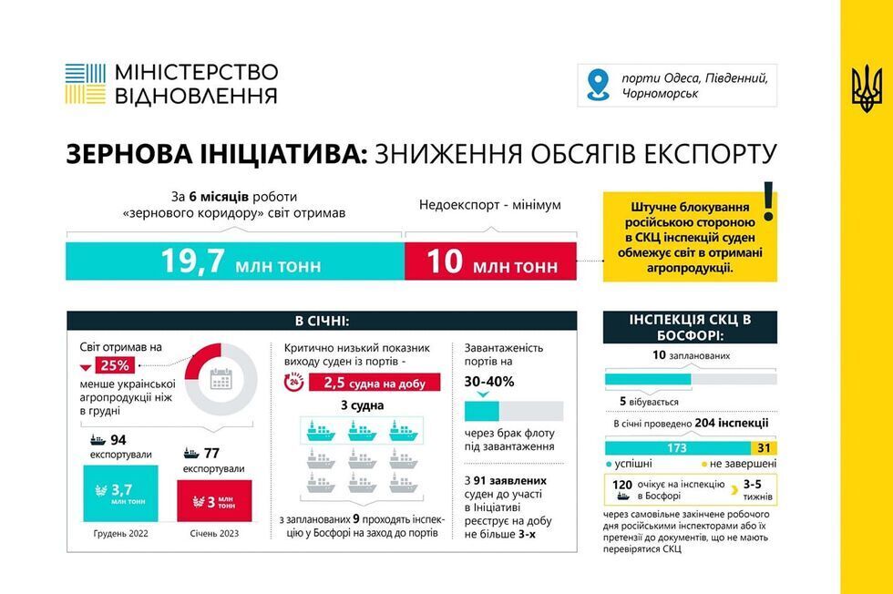 В январе 2023 года из украинских морских портов Пивденный, Черноморск и Одесса (Большая Одесса) в рамках "зернового соглашения" вышли 77 судов с 3 млн тонн агропродукции, что на 25% меньше по сравнению с декабрем 2022 года, проинформировало 5 февраля в Facebook Министерство развития общин, территорий и инфраструктуры. В инфографике ведомства сказано, что из портов выходили в среднем 2,5 судна в день и это "критически низкий показатель". Происходящее Мининфраструктуры связывает с искусственной блокировкой со стороны представителей РФ.