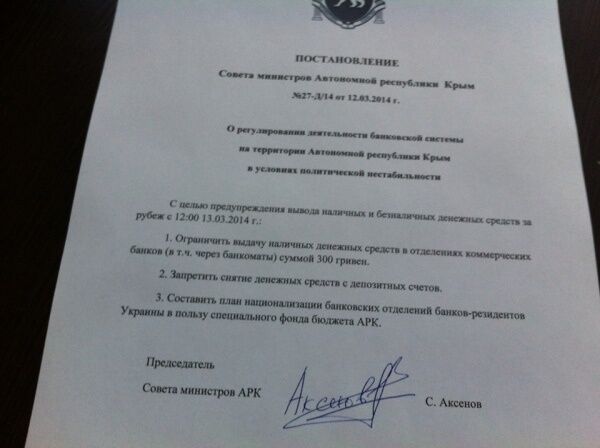 Согласно этому документу, с 12:00 13 марта коммерческие банки в Крыму не имеют права выдавать клиентам больше 300 грн наличных, а также обязаны полностью заблокировать выдачу депозитов. В этом же документе "премьер" Крыма заявляет о составлении плана национализации отделений банков-резидентов Украины. Средства Аксенов планирует передать в "специальный фонд бюджета АРК".