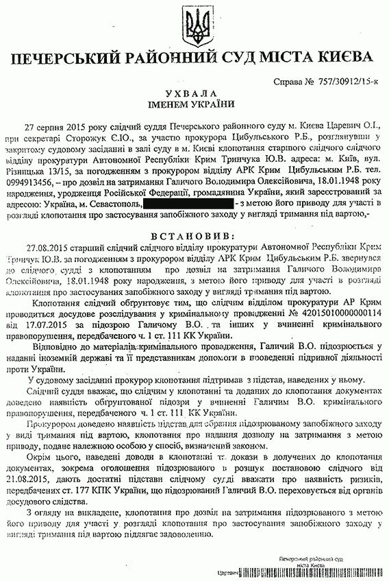 Основанием для задержания стало постановление Печерского суда от 27 июля 2015 о разрешении на задержание с целью привода в суд Галичего, подозреваемого в совершении преступления ч.1 ст.111 Уголовного кодекса Украины (государственная измена). "Севастопольская газета" приводит этот документ.