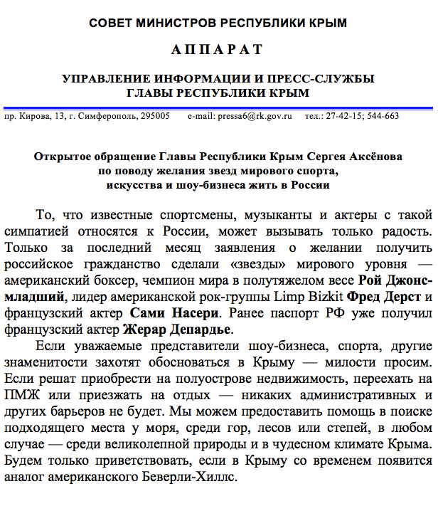 Аксенов, в частности, говорит о "желании" мировых звезд получить российский паспорт, приводя в пример боксера Роя Джонса-младшего, лидера американской рок-группы Limp Bizkit Фреда Дерста и французского актера, известного по фильму "Такси", Сами Насери.