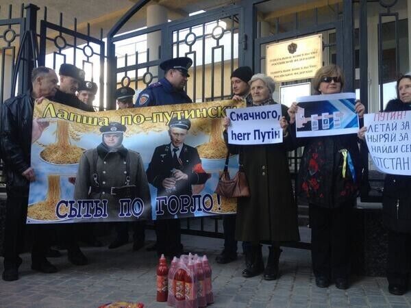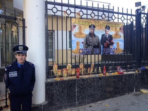 Под стенами консульства РФ в Одессе прошла немногочисленная акция против российской пропаганды под названием "Обед у консула". Участники протеста забросали российское представительство лапшой с кетчупом.