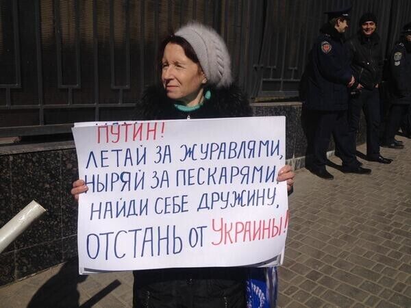 Некоторые протестующие пришли с плакатами "Смачного, herr Путин!", "Путин! Летай за журавлями, ныряй за пескарями, найди себе дружину, отстань от Украины!".