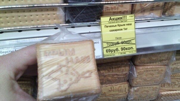 В супермаркетах российского города Пенза появилось печенье "Крымнаш". На нем изображен контур полуострова и соответствующая надпись. Продается печенье фасованным в полиэтиленовые пакеты по 200–300 гр. Об этом сообщает газета "Наш гороd Пенза".