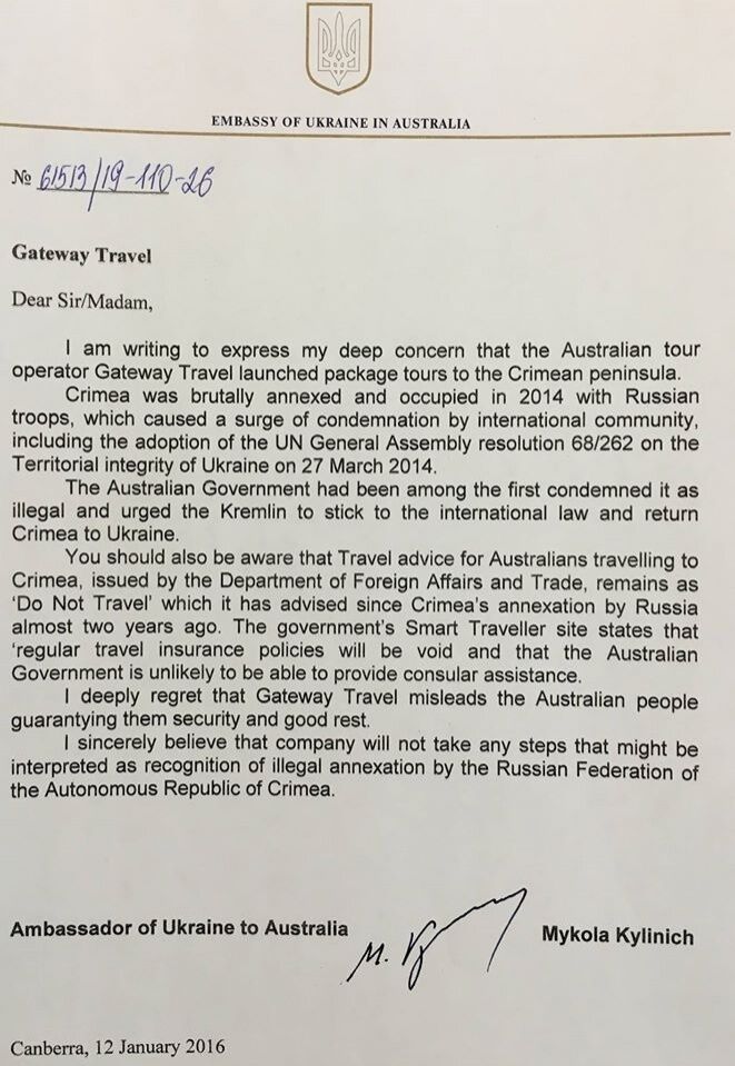 Посольство Украины в Австралии и Союз украинцев в этой стране выразили протест туроператору Gateway Travel в связи с запуском с начала года продаж путевок в аннексированный Россией Крым. Соответствующее заявление направил посол Украины в Австралии Николай Кулинич в министерство иностранных дел Австралии, о чем сообщила пресс-служба украинского представительства.
