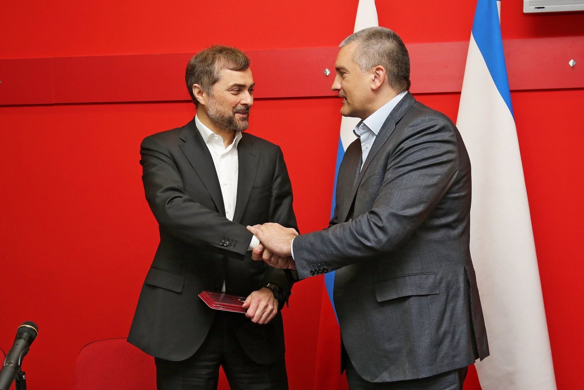 Председатель российского "правительства" Крыма Сергей Аксенов наградил помощника президента России Владислава Суркова "за проявленное личное мужество и патриотизм в защите конституционных прав и свобод жителей Крыма".