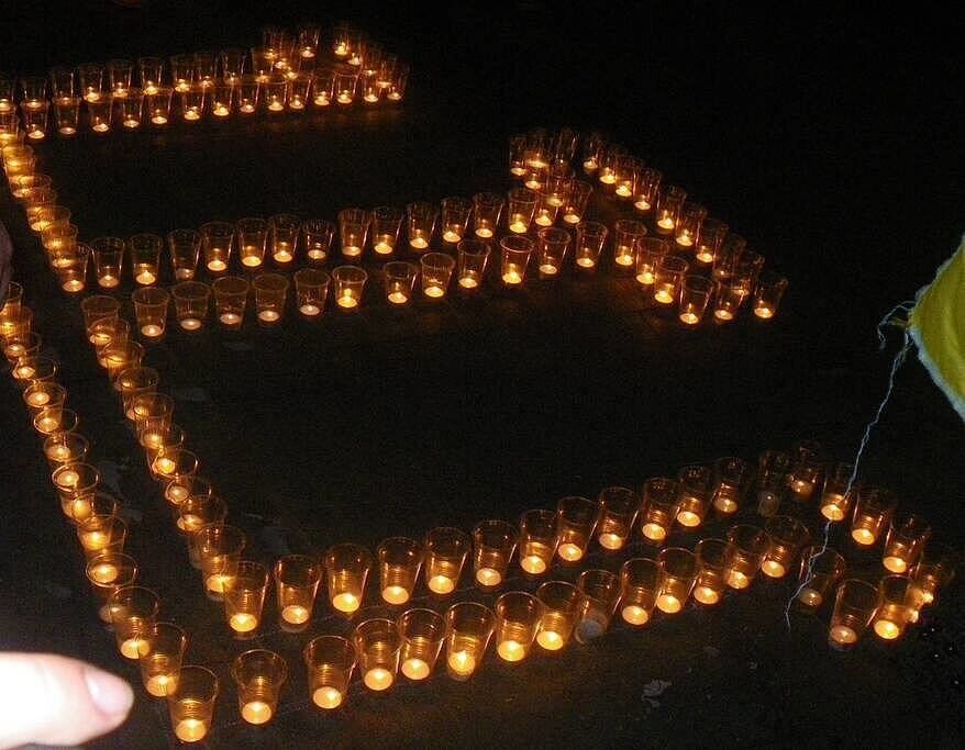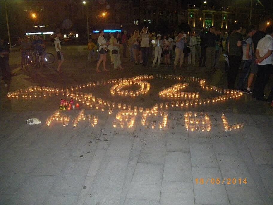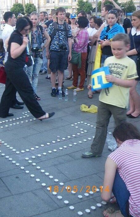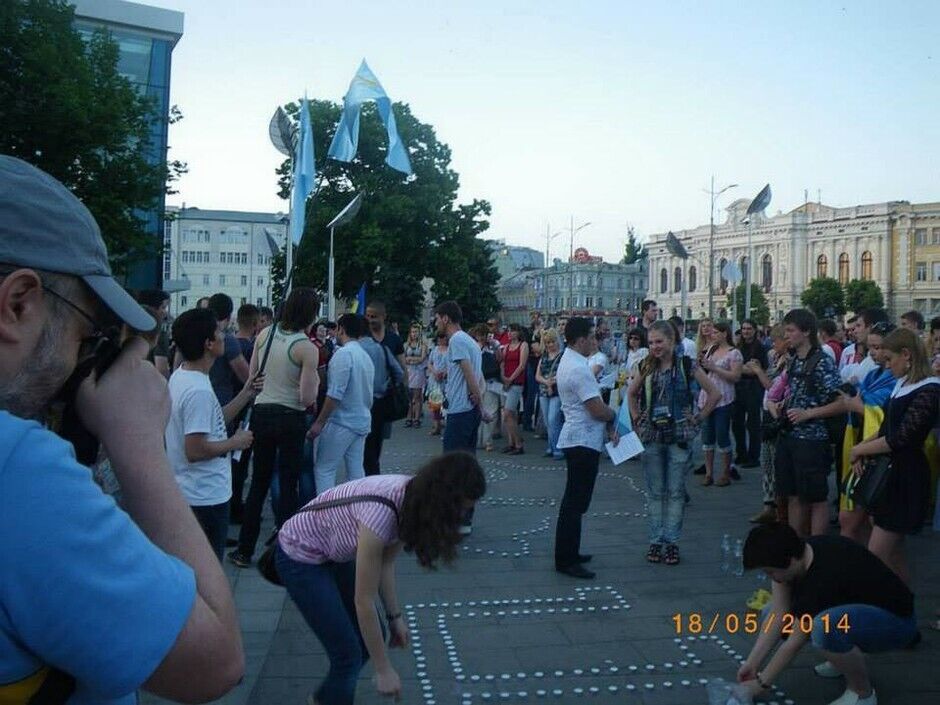 На площади Конституции в Харькове выложили из свечей карту Крыма с числом 70 в середине, герб Украины и герб крымских татар – тамгу. Перед этим состоялось шествие от памятника Шевченко к площади Конституции, горожане шли с желто-голубыми лентами и флагами.