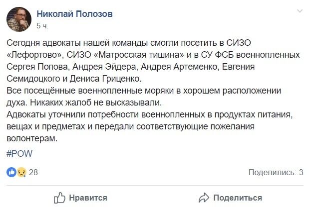 "Сегодня адвокаты нашей команды смогли посетить в СИЗО "Лефортово", СИЗО "Матросская тишина" и в СУ ФСБ военнопленных Сергея Попова, Андрея Эйдера, Андрея Артеменко, Евгения Семидоцкого и Дениса Гриценко. Все посещенные военнопленные моряки в хорошем расположении духа. Никаких жалоб не высказывали", – написал он.