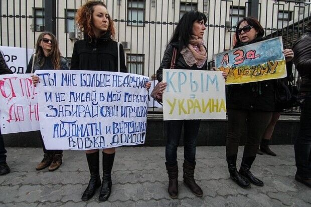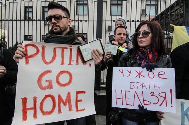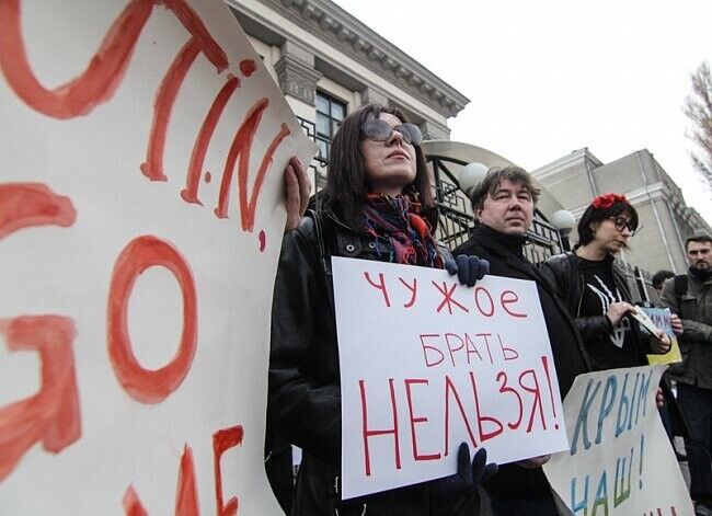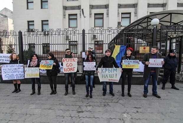 Сегодня, 15 марта, в Киеве около здания посольства России в Украине жители Крыма провели митинг против проведения 16 марта референдума о статусе полуострова. Протестующие держали в руках плакаты с надписями о том, что Крым – территория Украины, и призывали президента России Владимира Путина вывести войска из полуострова.