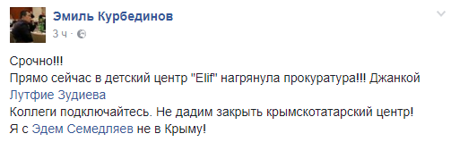 В детский крымскотатарский центр Elif в аннексированном Крыму пришли российские силовики, сообщил крымский адвокат Эмиль Курбединов в своем Facebook.