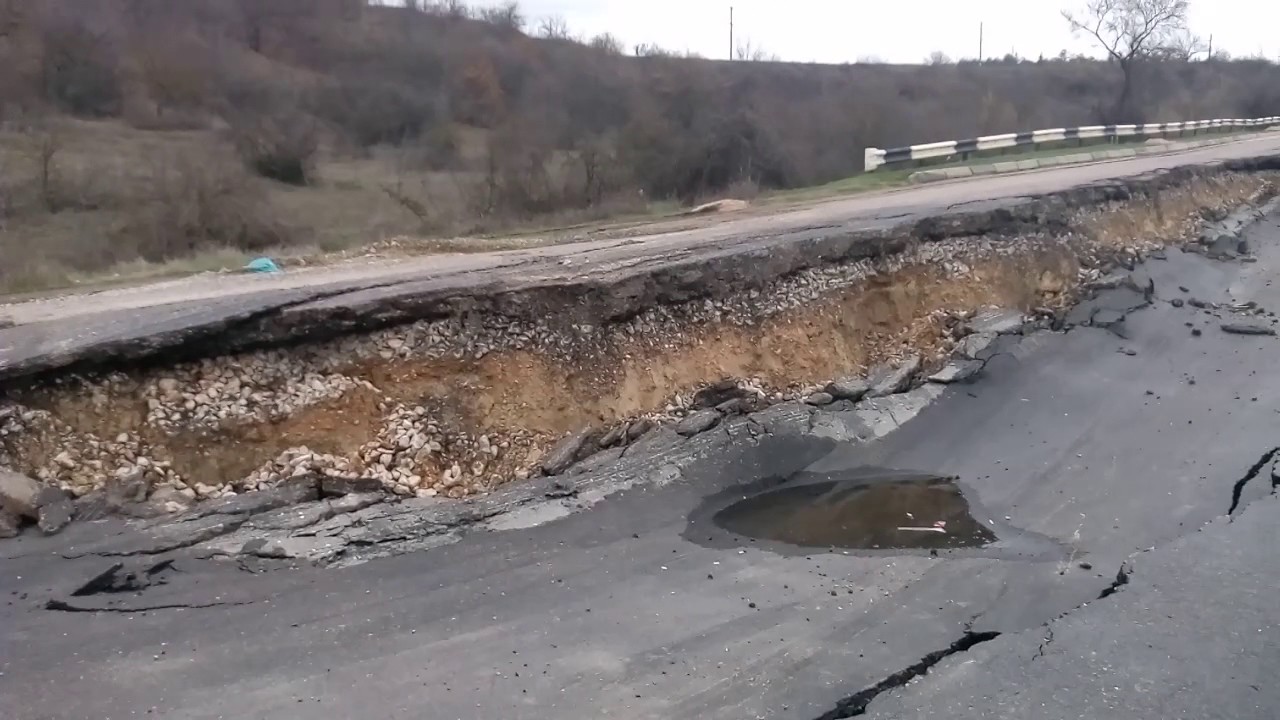 В Крыму разрушился участок дороги между Севастополем и Симферополем. Видео