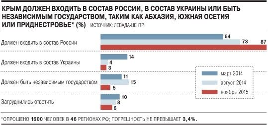 В России полуостров Крым считают украинским 3% граждан, сообщает "КоммерсантЪ" со ссылкой на исследование "Левада-центра".