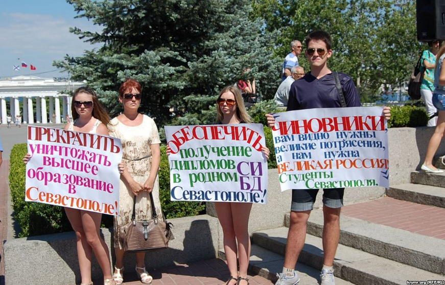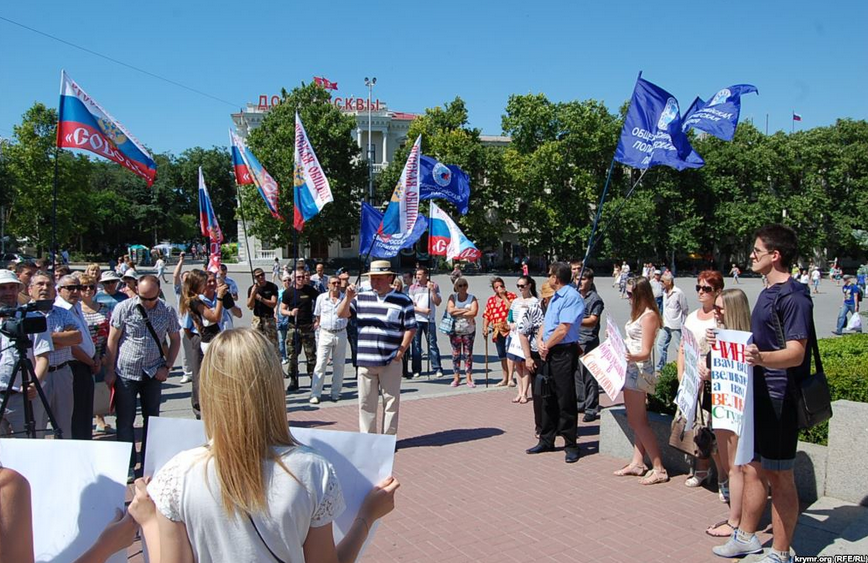 Среди участников митинга были бывший президент Крыма Юрий Мешков, члены российской партии "Народ против коррупции", представители казачьей общины "Соболь", сотрудники Севастопольского института банковского дела (СИБД), а также предприниматели, студенты и пенсионеры.