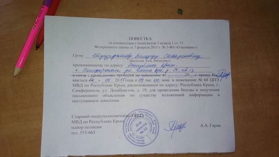 Крымскому активисту, члену крымского Украинского культурного дома Вельдару Шукурджиеву вручили повестку для явки в центр противодействия экстремизму при российском МВД Крыма в Симферополе. Об этом Шукурджиев написал в своем Facebook.