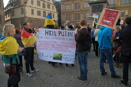 10.50 Украинцы немецкого Штутгарта провели акцию протеста против военной агрессии Российской Федерации в Крыму. На акцию собралось более сотни человек.