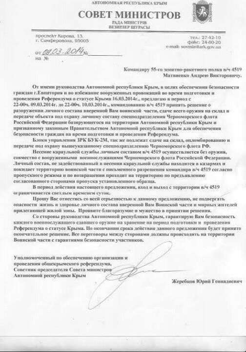 09.45 Совмин Крыма выдвинул ультиматум воинский части в Евпатории: "о разоружении личного состава, сдаче всего оружия на склад и передачи объекта под охрану спецподразделению Черноморского флота Российской Федерации".