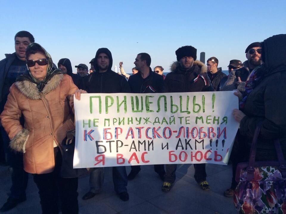 16.44 В Ялте люди с российскими флагами ворвались на проукраинский митинг и напали на мирных митингующих с украинской символикой. Около 50 молодых мужчин с флагами Российской Федерации и выкриками "Россия", "Фашизм не пройдет!" сперва окружили мирных собравшихся, а потом столкнули их со сцены и заняли ее. В потасовках никто серьезно не пострадал. Местные жители уверены, что напавшие – россияне.