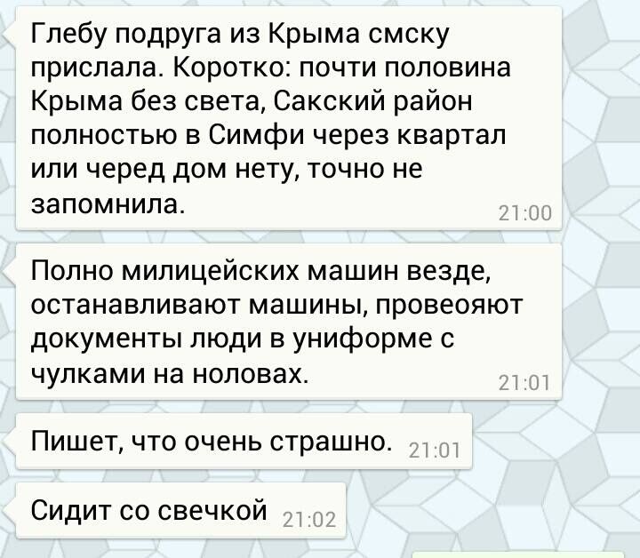 Пользователь Masha Bondarchuk в комментариях под сообщением Пашаева цитирует смс, полученную мужем ее подруги: "Почти половина Крыма сидит без света, Сакский район полностью, в Симфи через квартал или через дом нету, точно не запомнила. Полно милицейских машин везде, останавливают машины, проверяют документы люди в униформе, с чулками на голове. Пишет, что очень страшно. Сидит со свечкой".