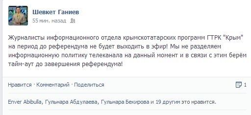 Журналисты информационного отдела крымскотатарских программ ГТРК "Крым" до референдума выходить в эфир не будут. Об этом сообщил главный редактор телекомпании Шевкет Ганиев на своей странице в Facebook.