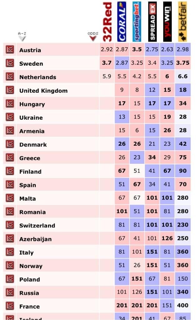 Согласно последним ставкам букмекеров, наибольшие шансы на победу финале в конкурсе "Евровидение", который проходит 10 мая в Копенгагене, имеют Австрия, Швеция и Голландия.