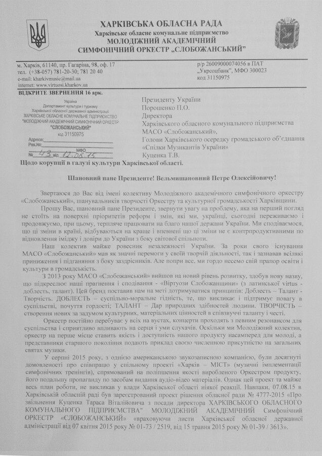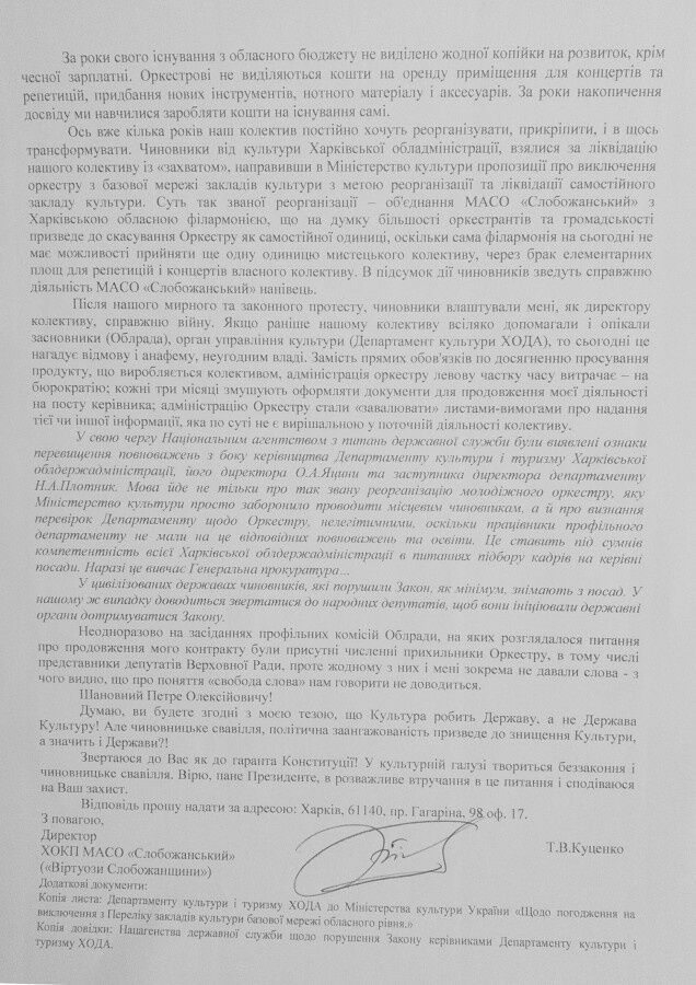 "Если раньше нашему коллективу всячески помогали основатели (Харьковский областной совет), то теперь... оркестр стали заваливать письмами-требованиями о предоставлении той или иной информации, которая, по сути, не является решающей в деятельности коллектива", – говорится в письме.