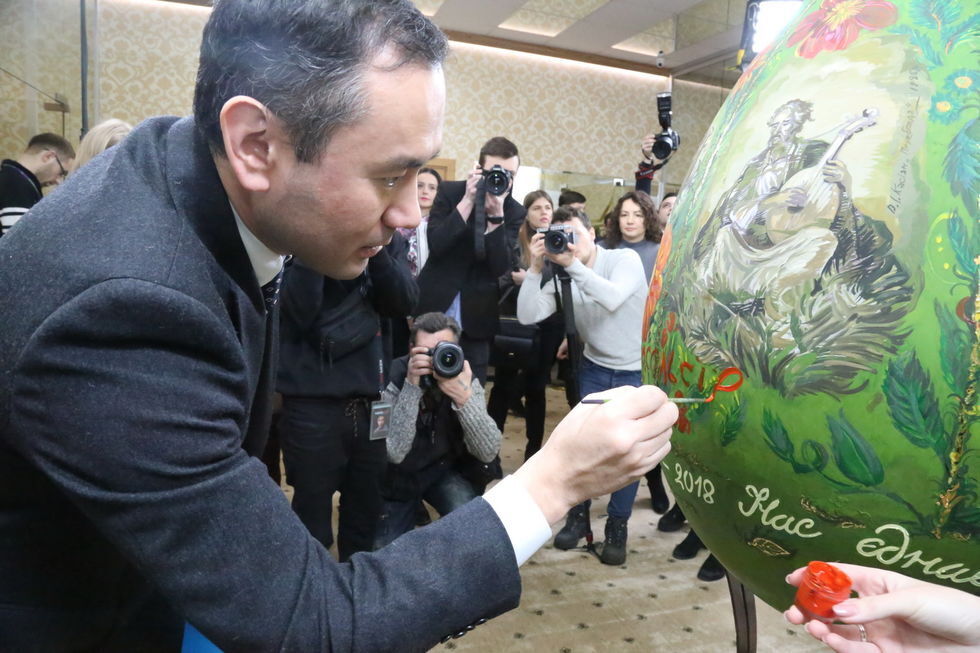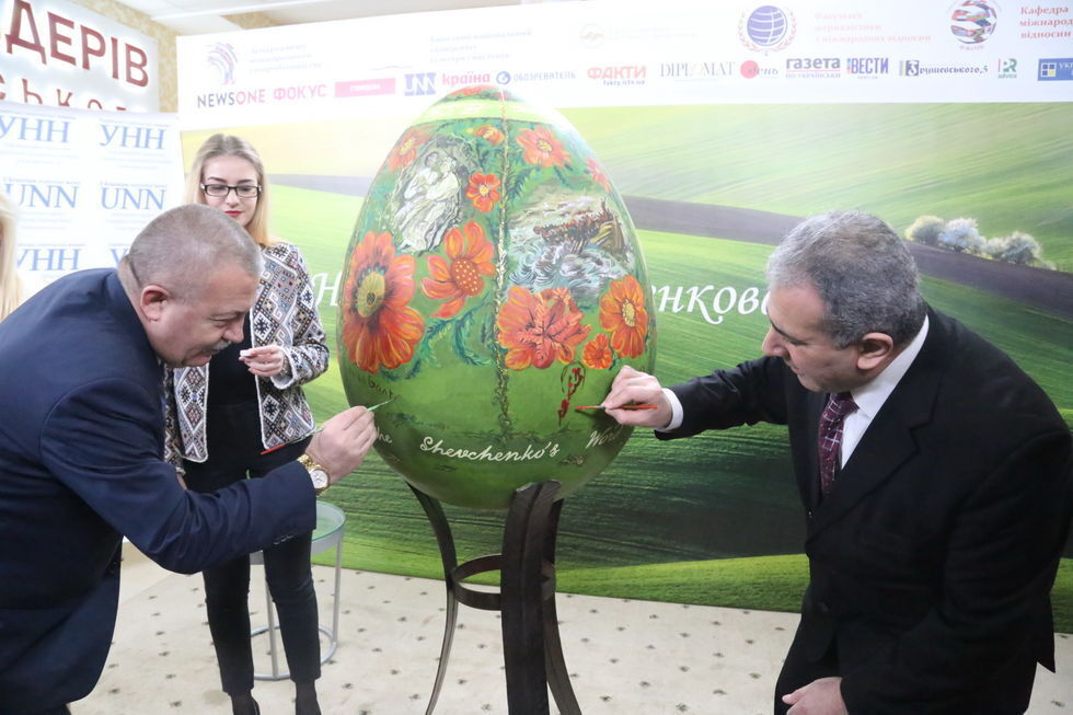 "Основу символа Пасхи с изображением картин по мотивам творчества Тараса Шевченко заранее разрисовали студенты КНУКиИ, а чрезвычайные и полномочные послы Болгарии и Палестины и представители посольств Казахстана, Грузии и Словении завершили узоры и поставили свои подписи", – сказано в сообщении.