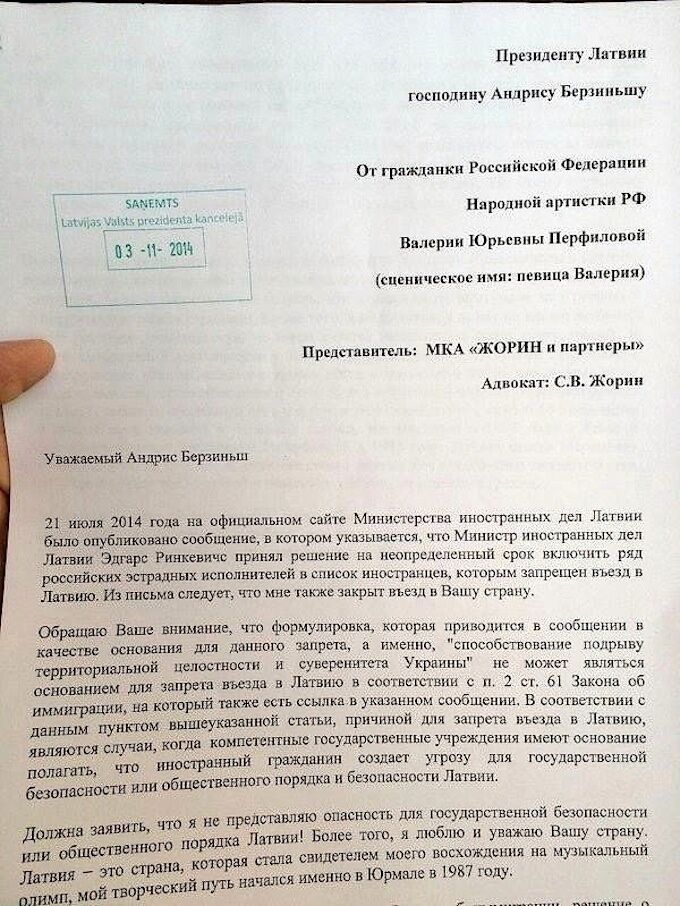 Валерия попросила латвийского президента не лишать ее права въезда в Латвию