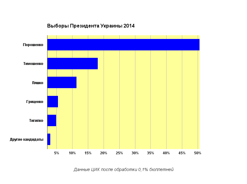 Согласно данным Национального экзит-полла, Петр Порошенко набрал 55,9 % голосов на выборах президента, Юлия Тимошенко – 12,9%.