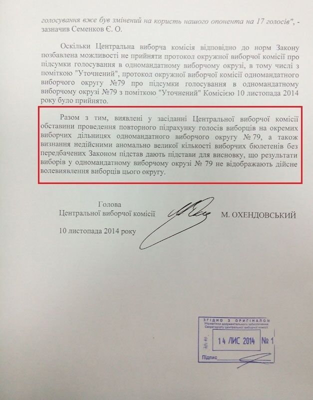 "Проведение повторного подсчета голосов избирателей на отдельных избирательных участках одномандатного избирательного округа №79, а также признание недействительными аномально большого количества избирательных бюллетеней без предусмотренных законом причин дают основания для вывода, что результаты выборов в одномандатном избирательном округе №79 не отображают настоящее волеизъявление избирателей этого округа", – написал в особом мнении глава ЦИК Михаил Охендовский.