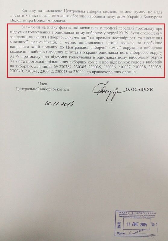 Кроме Охендовского, свои замечания по поводу результатов выборов в особых мнениях изложили заместители главы ЦИК Жанна Усенко-Черная и Андрей Магера, также члены ЦИК Юлия Швец, Игорь Жиденко, Александр Осадчук, Олег Диденко, Екатерина Березюк, Валерий Шелудько и Юрий Данилевский.По мнению некоторых членов комиссии, копии протоколов об итогах голосования в округе №79 и протоколы участковых избирательных комиссий необходимо передать в правоохранительные органы.