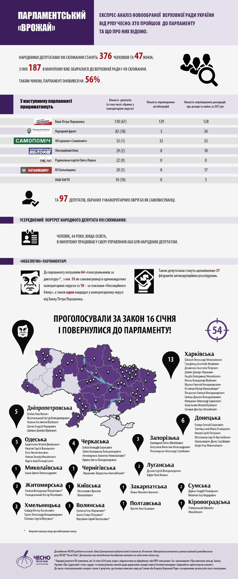 В Верховную Раду VIII созыв проходит 64 народных депутата, которые поддержали так называемые диктаторские законы от 16 января 2014 года. Об этом в четверг, 30 октября, сообщается на сайте общественно движения "Чесно".