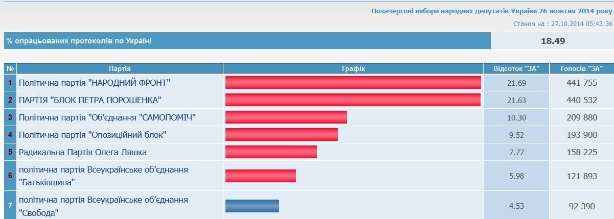 По состоянию на 5.43 понедельника, 27 октября, на внеочередных выборах в Верховную Раду Украины лидирует "Народный фронт", который набрал 21,69% голосов. Таковы данные на своем сайте приводит Центральная избирательная комиссия, которая обработала 18,49% протоколов.