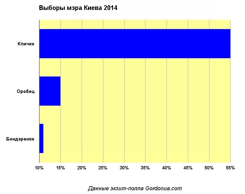 Согласно экзит-поллу, проведенному Gordonua.com, за Виталия Кличко в качестве мэра Киева отдали свои голоса 55% избирателей столицы.
