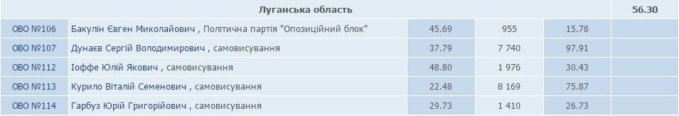 Согласно информации на сайте Центральной избирательной комиссии, только в одном из пяти округов в Луганской области (№107), где 26 октября состоялись внеочередные выборы, подсчитаны почти 98% протоколов. В остальных четырех, о которых говорил Геращенко, на сегодняшний день обработаны от 15,78% до 75,87%, это худший результат по Украине.