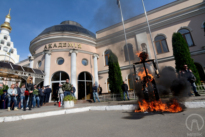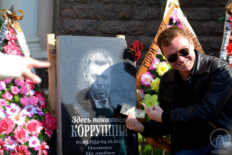 4 октября в Одессе активисты устроили акцию возле юридической академии. На место событий евромайдановцы приехали на БРДМ. С собой они привезли чучело с фотографией кандидата в народные депутаты, действующего депутата от Партии регионов, экс-ректора Одесской юридической академии и экс-главы ЦИК Сергея Кивалова, сообщает местное издание "Таймер". Одесский портал "Маяк" подчеркивает, что чучело просто "слегка напоминает" кандидата в народные депутаты Сергея Кивалова. Муляж торжественно сожгли и устроили пышные "похороны коррупции" с венками, цветами, траурными лентами и надгробной плитой.