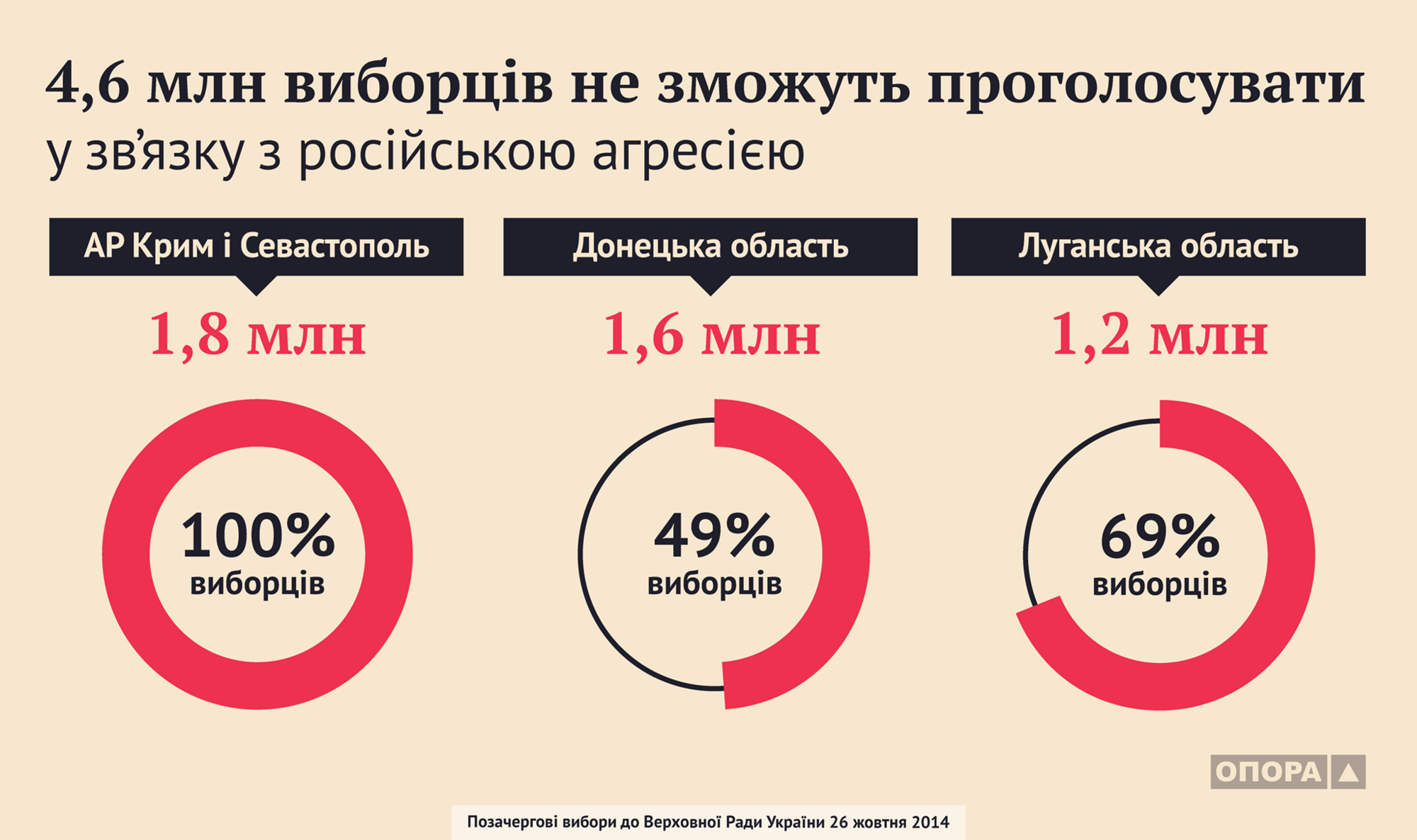 По данным "Опоры", в Крыму и Севастополе не проголосуют 100% избирателей (1,8 млн человек), в Луганской области – 69% (1,2 млн), в Донецкой области – 49% (1,6 млн).