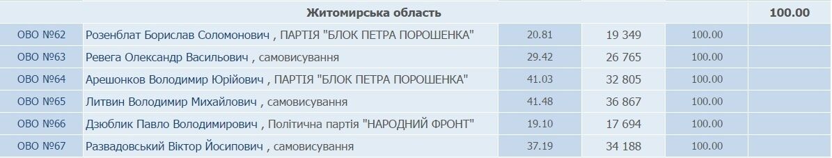 Так, в округе №62 (центр – город Житомир) победу одержал выдвиженец Блока Петра Порошенко, бизнесмен Борислав Розенблат, за которого проголосовали 20,81% избирателей. Ближайшая его соперница, кандидат от "Самопомочі", директор компании "Агромак Трейд" Наталия Чиж, набрала 13,19% голосов.