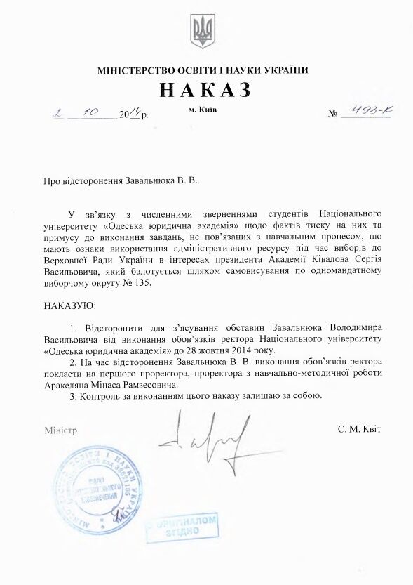 Министр образования и науки Украины Сергей Квит отстранил от исполнения своих обязанностей ректора Одесской юридической академии Владимира Завальнюка за агитацию за президента этой академии, кандидата в народные депутаты Сергея Кивалова. Об этом говорится в указе Квита от 2 октября, опубликованном на сайте министерства.