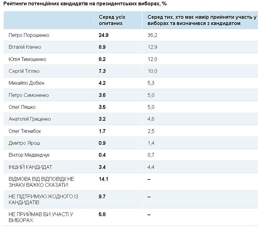 "Петра Порошенко готовы поддержать 24,9% опрошенных респондентов. Вторую позицию занимает Виталий Кличко – 8,9%, а третью – Юлия Тимошенко с 8,2%", – говорится на официальном сайте общественной организации.