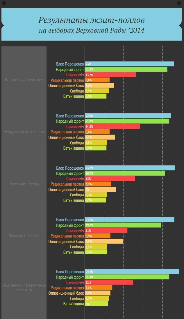 Первое место с перевесом в несколько процентов занимает Блок Петра Порошенко, на втором месте – "Народный фронт", на третье место неожиданно вышла партия "Самопомощь", созданная мэром Львова Андреем Садовым за несколько месяцев до выборов. В парламент также проходят Оппозиционный блок, Радикальная партия Олега Ляшко, ВО "Свобода" и ВО "Батьківщина".