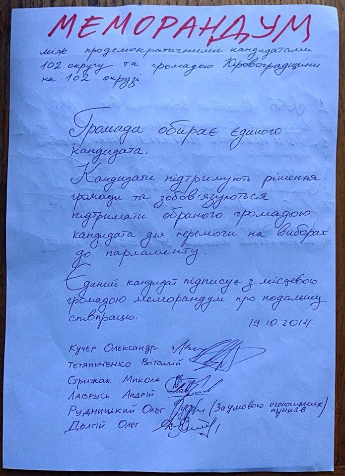 "Шестеро кандидатов в 102-м округе согласились объединить свои усилия в поддержку единого кандидата Андрея Лавруся, предложенного представителями общественности, с которыми все шестеро подписали соответствующий меморандум. Единый кандидат был представлен сегодня на вече в Светловодске", – отметил журналист.