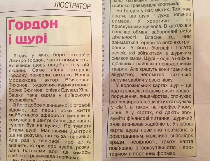 В статье под названием "Гордон і щури" анонимный автор утверждает, что "после интервью Гордону умерли актриса Нонна Мордюкова, актер Вячеслав Тихонов, художник-карикатурист Борис Ефремов и певец Эдуард Хиль". "Откуда такая карма у киевского журналиста?" – интересуется безымянный автор и развивает мистическую теорию о влиянии крыс на людей.