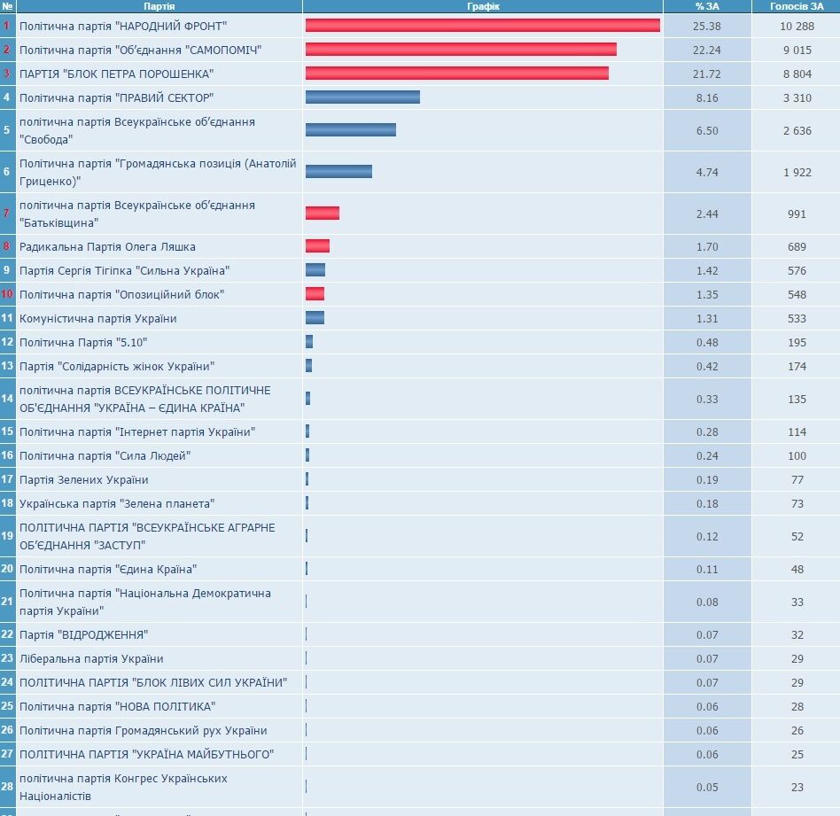 "Самопоміч" Андрея Садового набирает 22,24%, партия Блок Петра Порошенко – 21,72%. Пятипроцентный барьер, также преодолевают партии "Правый сектор" Дмитрия Яроша (8,16%) и ВО "Свобода" Олега Тягнибока (6,50%).