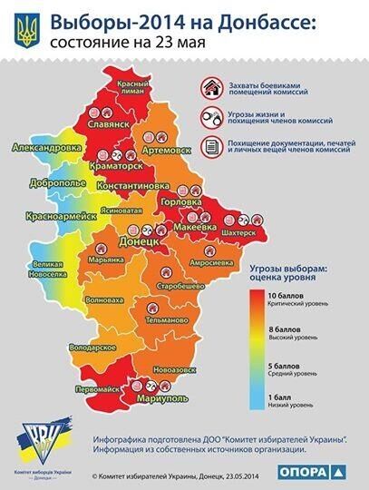 Начиная с конца апреля, боевики похищают членов избирательных комиссий. По состоянию на утро 20 мая всех ранее похищенных председателей ОИК освободили.