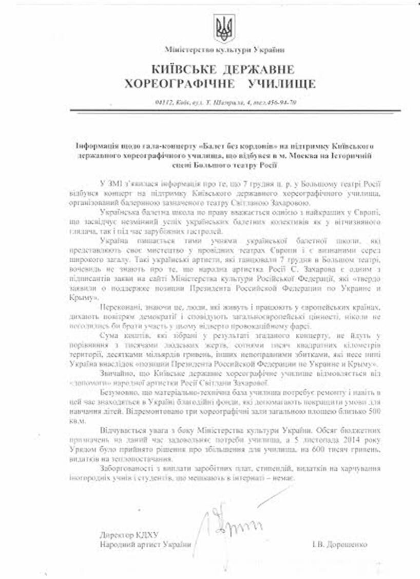 В Большом театре в Москве состоялся гала-концерт "Балет без границ" в поддержку Киевского хореографического училища (КГХУ), автором идеи и художественным руководителем которого выступила солистка Большого театра Светлана Захарова, выпускница киевского училища. Однако в КГХУ отказались от средств, сообщает пресс-служба Министерства культуры Украины.