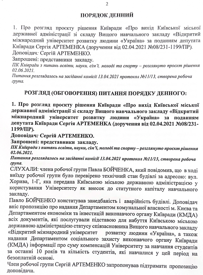 "С этого момента началось более-менее приличное размещение администрации и обучение студентов", – сказано в сообщении.Как выяснили журналисты, по адресу: улица Хорива, 1г расположена кафедра дизайна университета. Сегодня это помещение закрыто и находится в заброшенном состоянии, что подтверждается протоколом постоянной комиссии по собственности Киевского городского совета от 2 июня 2021 года.