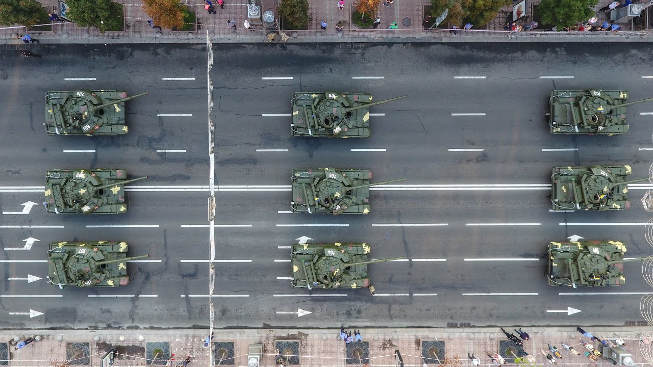 19 августа во второй половине дня на столичном Крещатике военные провели репетицию парада ко Дню Независимости Украины. "Українські новини" сняли это событие с высоты птичьего полета и опубликовали на своем канале в YouTube.