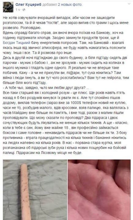 Активист "Правого сектора", кандидат в народные депутаты 2014 года Олег Куцериб избил вместе со своим сыном у подъезда двух человек, показавшихся ему гомосексуалами. Об этом он написал на своей странице в Facebook.