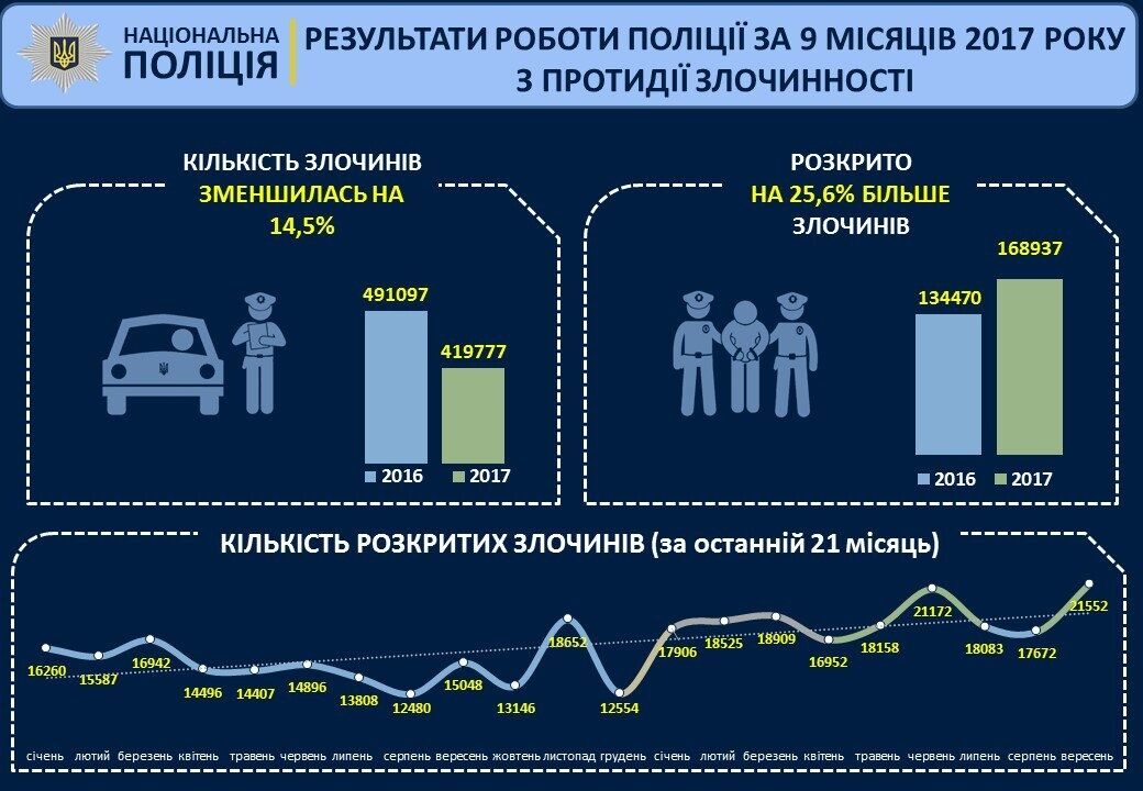 15 октября замглавы Национальной полиции Украины Вячеслав Аброськин заявлял, что за девять месяцев 2017 года в Украине произошло 1185 умышленных убийств и покушений. По его словам, это самый низкий показатель за 10 лет.